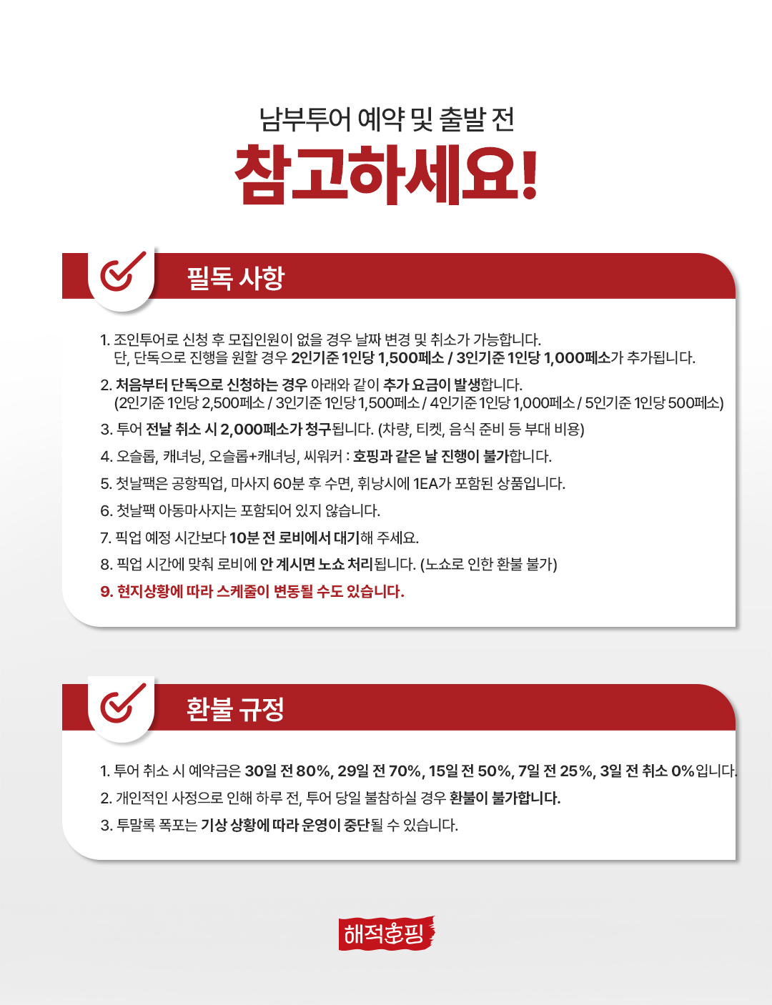 ② 여행자 본인의 과실로 인한 안전사고는 본인이 책임을 지게 되니 각별한 주의를 당부드립니다.